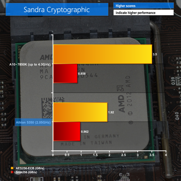 The Athlon 5350 delivers promising encryption and decryption performance, as proven by the Sandra Cryptographic test.
