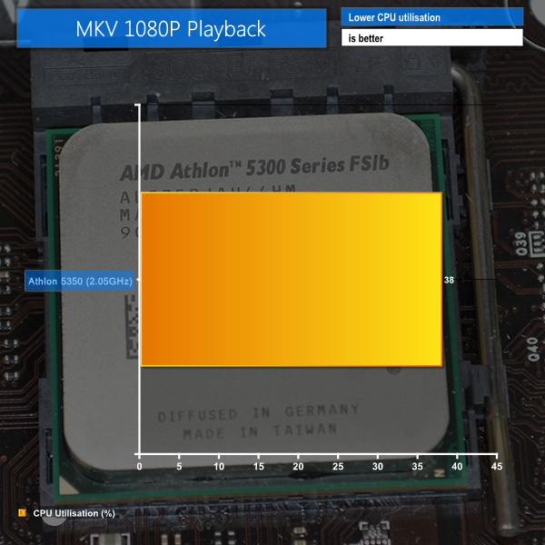 CPU utilisation when playing back high bit-rate HD content hovers around 38%. With their low TDPs, Kabini parts have strong potential for usage in HTPC environments.