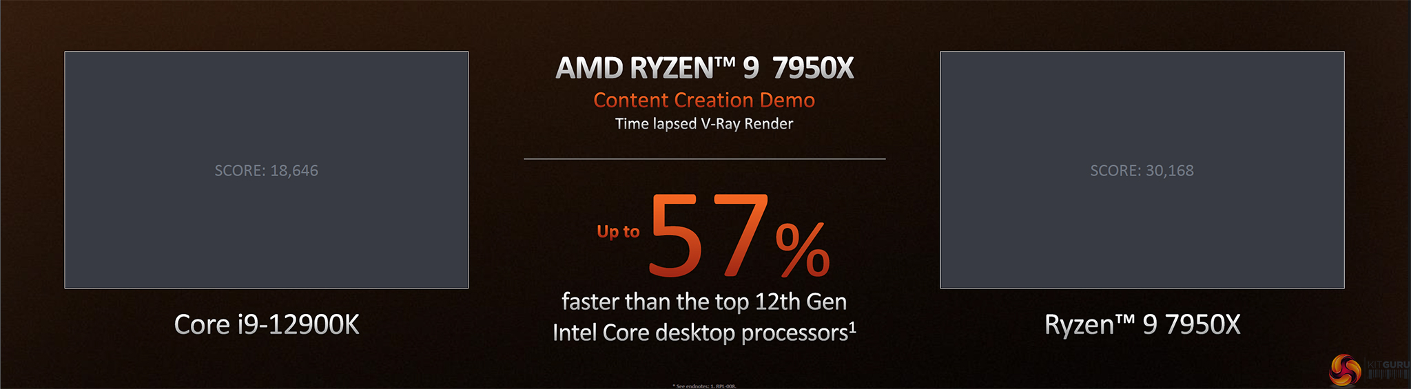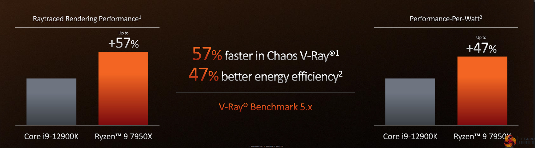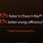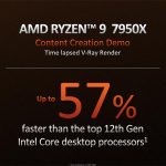 In fact, AMD was very keen to show off its performance advantages for the Ryzen 9 7950X versus Intel’s Core i9-12900K. In a V-Ray rendering workload that we were shown at the launch announcement in Texas, AMD’s chip was up to 57% higher performance with up to 47% better performance-per-Watt.