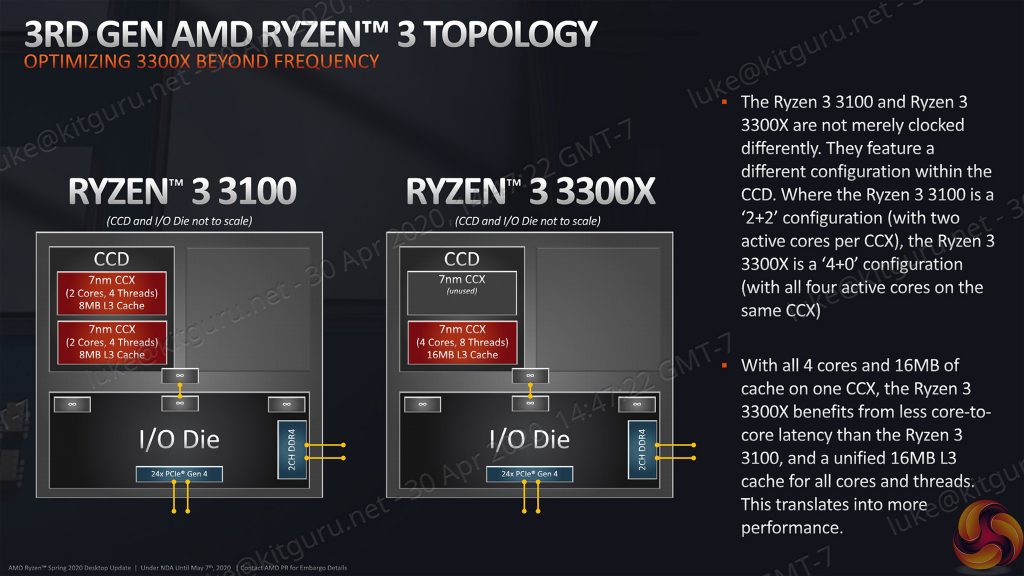 There is more to the differences between the parts than simply frequency and naming, though; Ryzen 3 3300X is a single-CCX design whereas the 3100 uses two CCXs. Given the pricing, AMD is clearly gunning for Intel's current 9th Gen Core i3 and the lower-end Core i5 options.