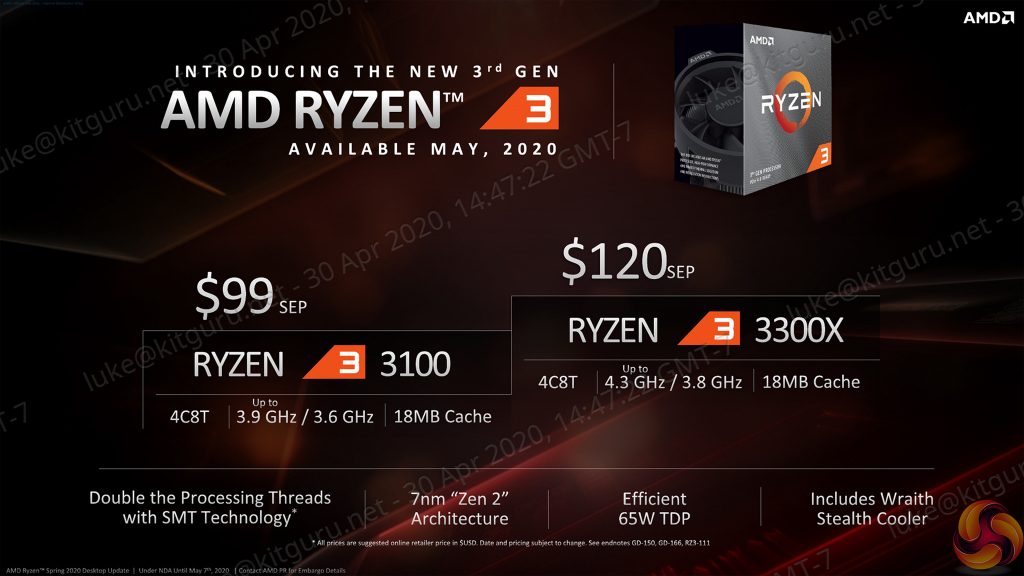The sub-£150 market segment has been a clear void in AMD's Zen 2 product stack. That changes today with the launch of four-core, eight-thread Zen 2-based Ryzen 3 chips. Coming in at £95 for the Ryzen 3 3100 and £115 for the 3300X, AMD is taking aim at Intel's current Core i3 and lower-end Core i5 offerings whilst also sending a warning shot across the bow of Intel's Comet Lake-S launch vehicle.