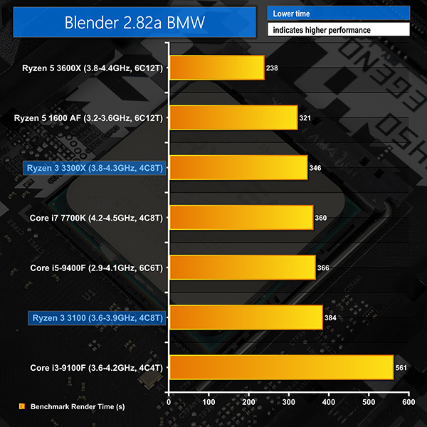 Ryzen 3 3300X in particular puts in another stellar display when looking at Blender’s BMW test. It will take a six-core Ryzen 5 1600 AF on the older Zen+ architecture to outperform the 3300X at this price point; Intel’s current competitors are significantly slower and even the trusty old 7700K cannot keep pace at stock clocks.