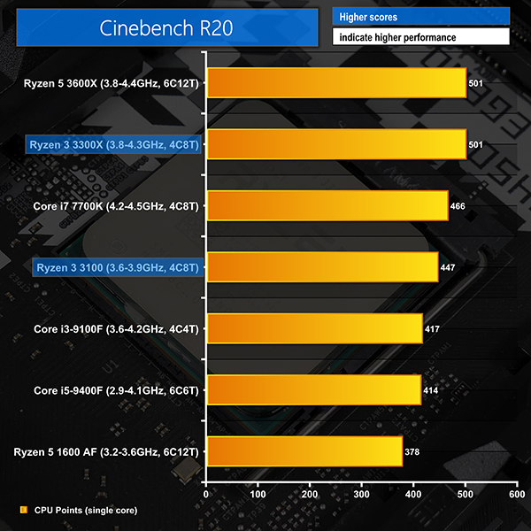 Thanks to its lofty 4.3GHz boost frequency, the 3300X hits joint-top position with just over 500 points in 1T testing. Around a 10% drop-off is observed when switching to the 3.9GHz Ryzen 3 3100. But that $99 part still beats out the similarly priced Ryzen 5 1600 AF, as well as the Intel competitors that run at comparable clock speeds.