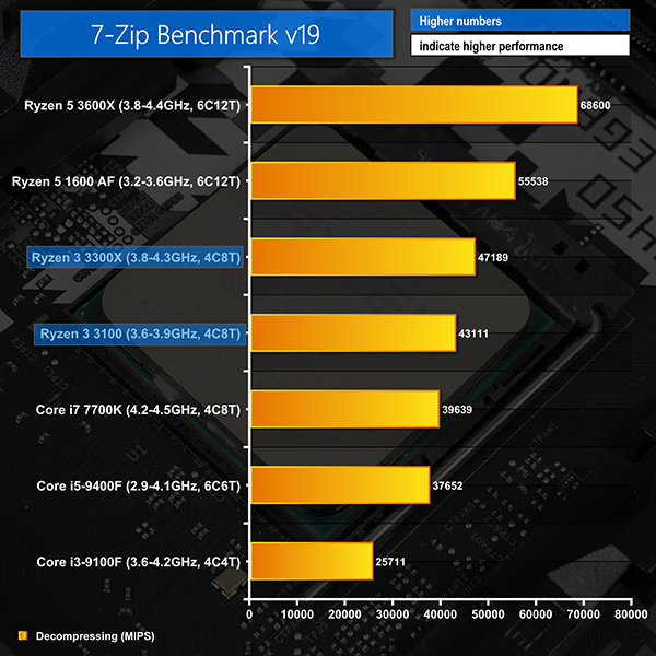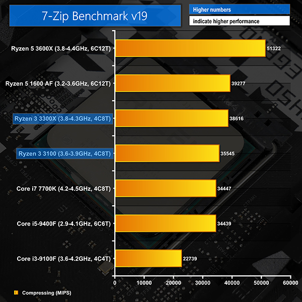 Unsurprisingly, the slower-clocked Ryzen 3 3100 drops off compared to its bigger brother. With that said, the £95 chip still manages to outshine the costlier Core i5-9400F and Core i7-7700K parts, albeit by a slim margin.