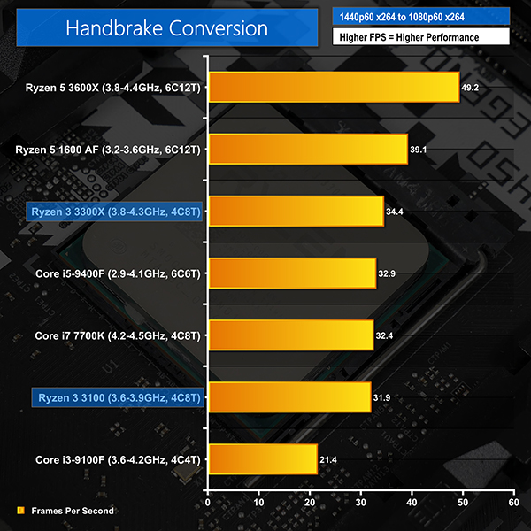 Ryzen 3 3300X outperforms the £25 more costly Core i5-9400F by 5% in our Handbrake x264 test. With that said, the £99 Ryzen 5 1600 AF overcomes its older Zen+ architecture with the brute force of a dozen processing threads to beat AMD’s new chip by 14%.