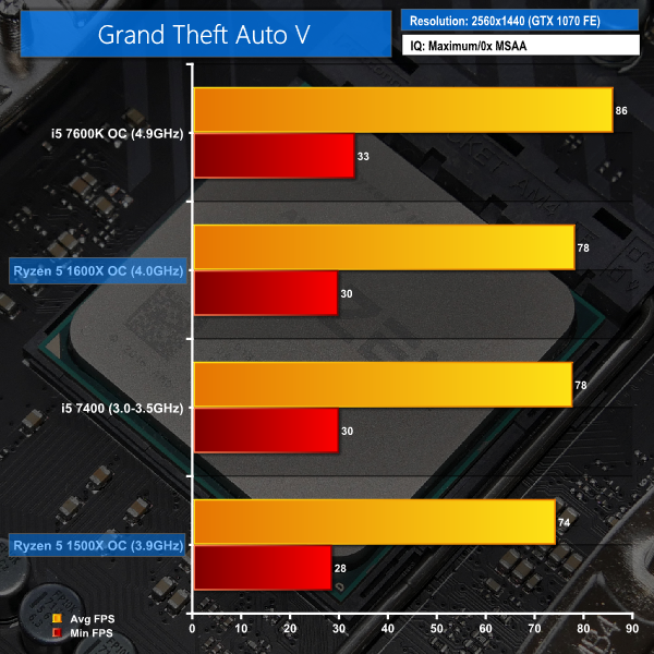 1440P gaming performance with a GTX 1070 is still stronger on the Core i5-7400 than on Ryzen 5 1500X in Gears of War 4 and GTA V. The performance deficits for Ryzen 5’s quad-core part are small but they are also measurable.