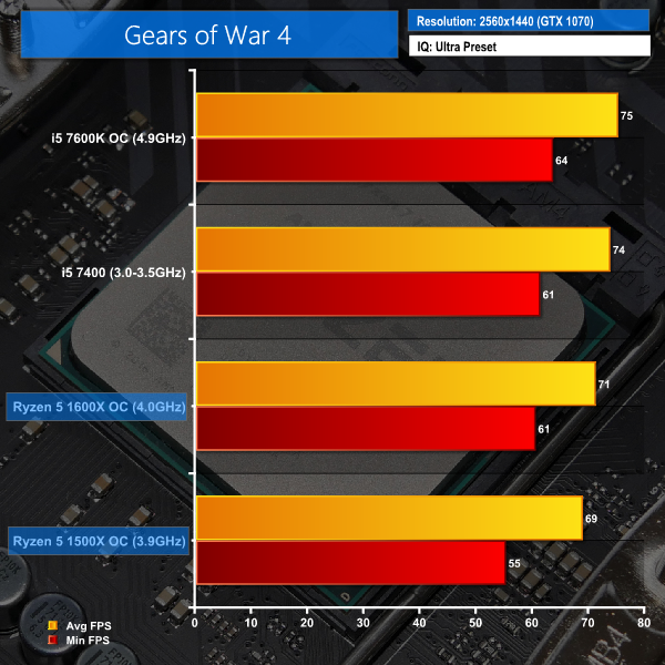 The testing was conducted with the CPUs overclocked to their highest levels (4.0GHz for the Ryzen 5 1600X, 3.9GHz for the Ryzen 5 1500X, 4.9GHz for the i5-7600K, and stock 3.0-3.5GHz for the locked i5-7400) in order to show how a user can squeeze out 1440P gaming performance from their CPU.