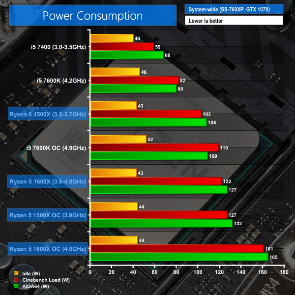 On the positive side, power draw from AMD’s 4C8T chip is less than an overclocked Core i5-7600K, despite the Ryzen 5 part delivering higher performance in Cinebench.
