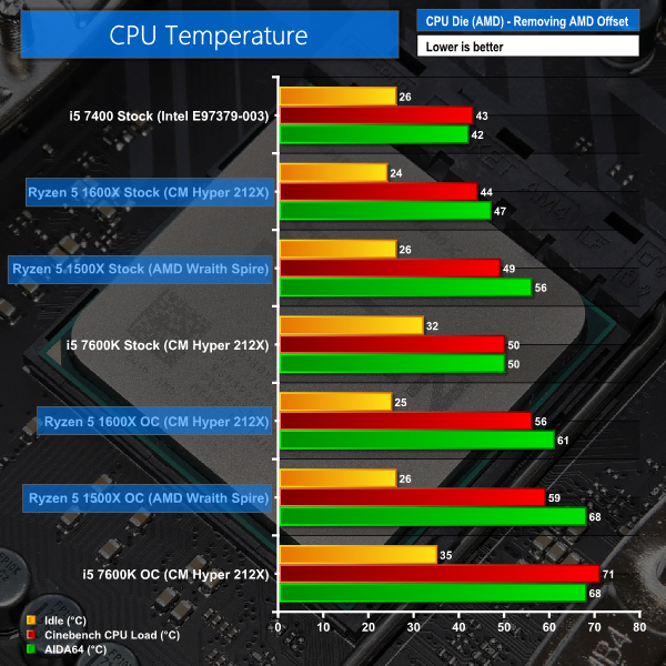 Temperature recordings were taken using the superb, cost-effective Cooler Master Hyper 212X for the Ryzen 5 1600X and the Core i5-7600K. The supplied coolers are used for Ryzen 5 1500X (AMD's Wraith Spire) and Core i5-7400 (Intel E97379-003 with an Aluminium slug).