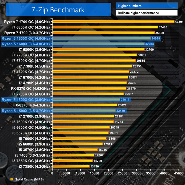 7-Zip leverages all eight of the Ryzen 5 1500X’s processing threads to return a handsome lead over the 4C4T i5-7400. At stock, Ryzen 5 1500X is 51% faster than the multiplier-locked Intel competitor. The lead grows to 62% when the 1500X is pushed to 3.9GHz. You get 7600K-beating performance from the 1500X in this program.