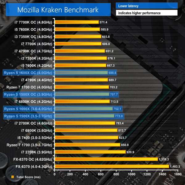 Mozilla Kraken is a browser-based JavaScript benchmark that tests a variety of real-world use cases. We use Chrome as the test browser. The test exhibits very little multi-threading and shows an affinity for CPU clock speed and IPC.