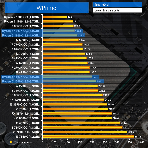 WPrime posts positive 1500X numbers thanks to its strong multi-threaded capabilities. All of Intel’s Kaby Lake Core i5 processors are outperformed by Ryzen 5 1500X. That’s before an overclock to the AMD chip even enters the equation.
