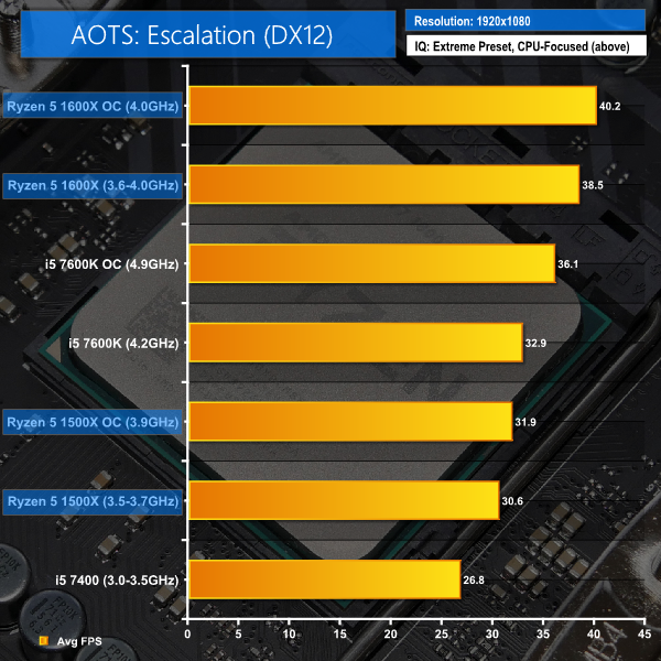 Ashes of the Singularity: Escalation and its recent Ryzen performance-boosting update fairs well on the 1500X. The similarly-priced i5-7400 is outperformed and an overclock for the Ryzen 5 quad-core takes it close to default 7600K performance.