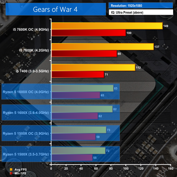Gears of War 4 does not show good performance on Ryzen 5. The 4C8T 1500X is placed at the bottom of our performance hierarchy and only manages an average frame rate just above 70 FPS. That is despite registering around 50-60% overall CPU utilisation with the loading spread well across all eight threads. Intel’s Core i5-7400 is faster in this benchmark, even if it is running at full load throughout.