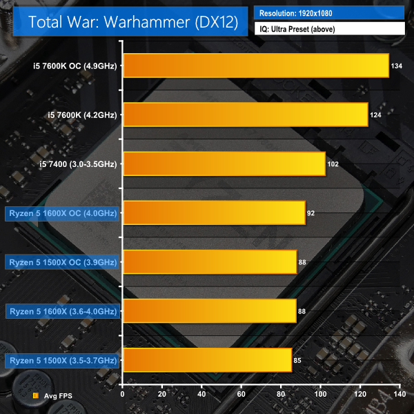 Total War: Warhammer in its DX12 mode likes clock speed and IPC. That IPC point is what gives Intel’s i5-7400 the victory over Ryzen 5 1500X. This benchmark forces one or two threads to very high levels of utilisation while another two threads are also used quite heavily and the four SMT threads are barely loaded.