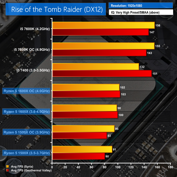 Rise of the Tomb Raider is another DX12 benchmark where Intel performs better. Ryzen 5 1500X doesn’t look so bad in this test as the performance loss from the six-core 1600X is lower. However, Intel’s similarly-priced Core i5-7400 is considerably faster in this game’s in-built benchmark. CPU usage was around 80-90% for the 1500X in this benchmark, with the load being spread across all eight threads but one of those being pinned close to 100% utilisation. What our numbers do not show, however, is the pop-in that we noticed with the Core i5-7400. This was not present on Ryzen 5 chips and therefore gives the 1500X an advantage despite its lower headline framerates.