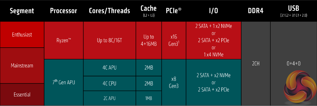 The logical partner for Ryzen 5 is a B350 chipset motherboard. Compared to the high-end (read: expensive) enthusiast-geared X370 motherboards found partnered with Ryzen 7, B350 forces you to give up PCIe bifurcation thus blocking multi-GPU CrossFire and SLI support, as well as a small number of USB 3.0, SATA 6Gbps, and PCIe 2.0 lanes.