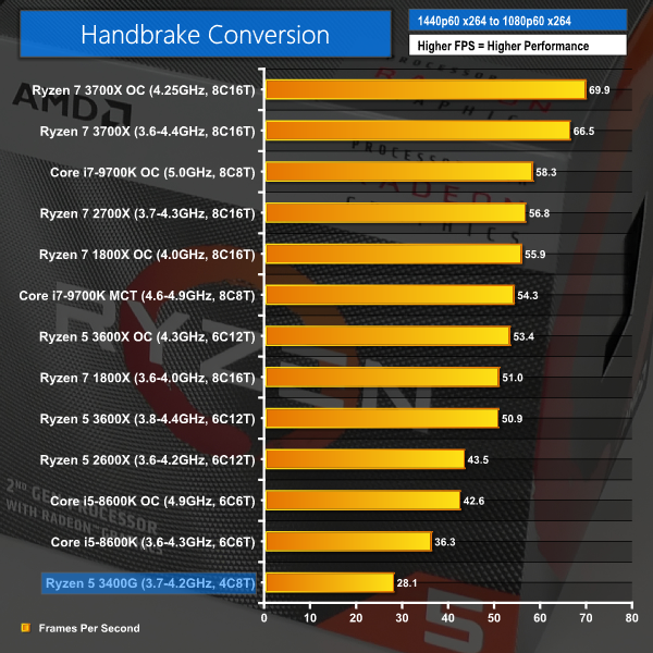 Handbrake shows that the Ryzen 5 3400G APU does a decent job at handling our x264 conversion test. You don’t get the AVX-based improvements of Zen 2 with this Zen+ based APU, but a conversion rate close to 30 FPS isn’t too bad given the asking price.