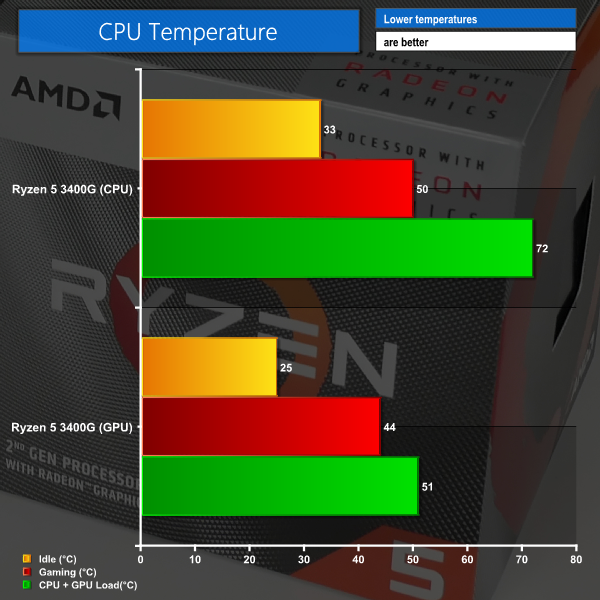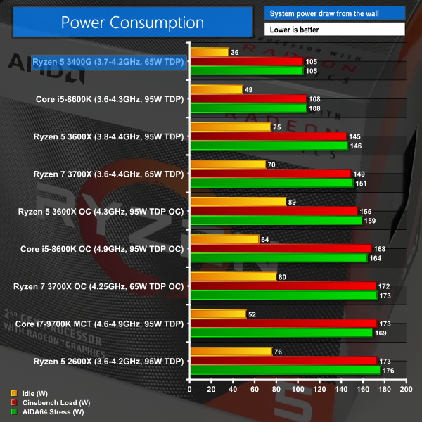 Power consumption is at a level where even the most budget of PSUs could handle the Ryzen 5 3400G without sweat. Just over 100W from a Cinebench CPU-only load is the same as we saw in AIDA64 CPU stress testing.