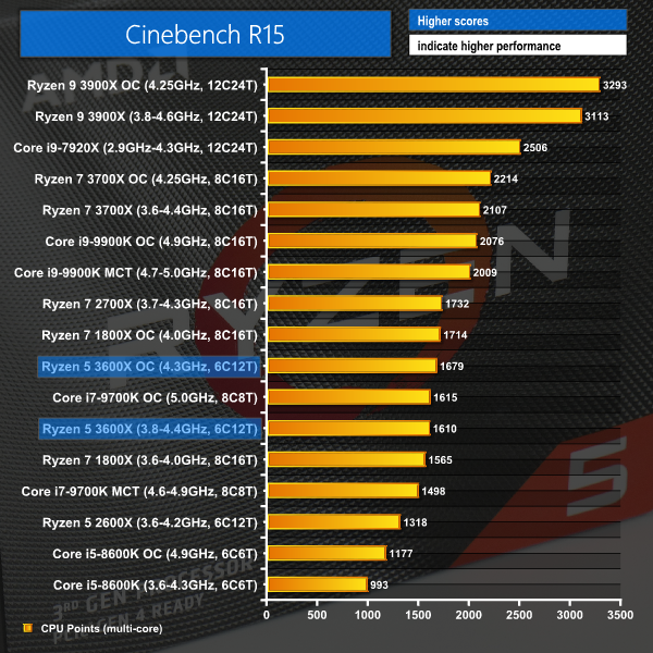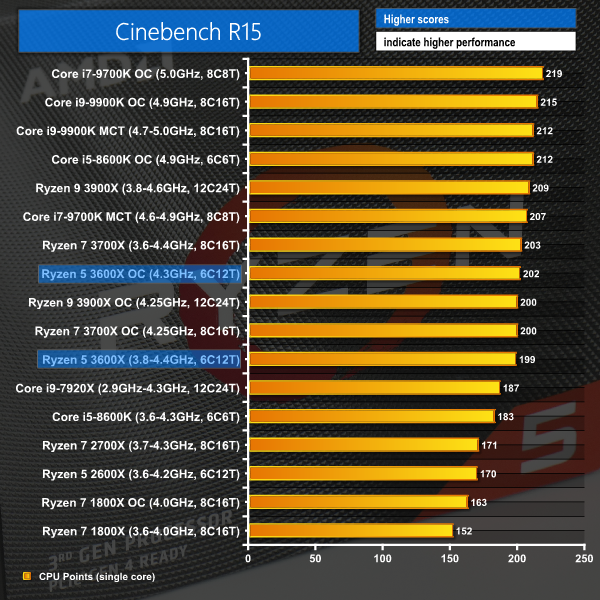 Architectural improvements for Zen 2 give the Ryzen 5 3600X strong single-threaded performance in Cinebench R15. However, Intel’s raw frequency advantage is generally able to make up for the lost ground and force its overclocked competitors to the top of the chart.