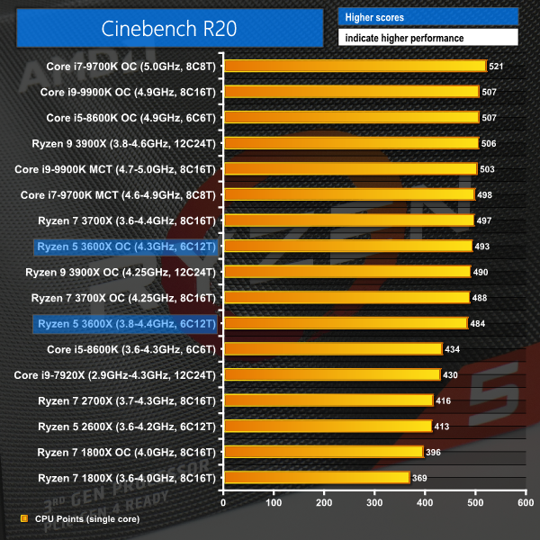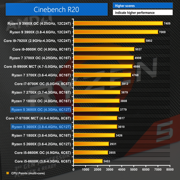 Focussing again on the 3600X versus Coffee Lake’s six-core i5, we see the Zen 2 chip providing a completely different tier of performance, beating out the stock and overclocked i5s by somewhere in the region of 1000 points. Even with the Intel processor overclocked to 4.9GHz, AMD’s six-core, twelve-thread Ryzen 5 3600X at stock speeds is able to offer 26% higher performance thanks to its superior multi-threading abilities. That performance gap widens when the Zen 2 CPU is overclocked to 4.3GHz, albeit very marginally.