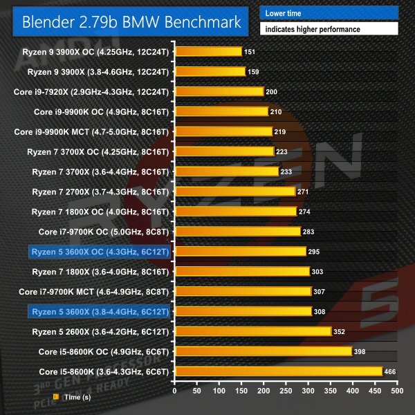 Multi-threaded rendering is an area where more cores and threads should deliver higher performance, even if frequency is lower. That’s exactly what we see with Ryzen 5 3600X and its twelve threads versus the six-thread Coffee Lake Core i5. Stock Ryzen 5 versus overclocked Core i5 sees a 90 second, or 23% reduction in render time for the AMD part. Overclocking the AMD chip to 4.3GHz sees the lead stretch to 26% and the overall render time comes in just below the 5-minute mark, if that’s significant to you.