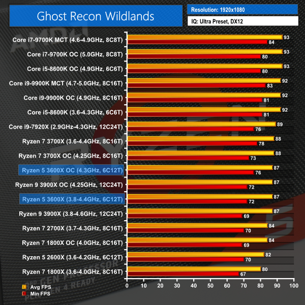 Ghost Recon Wildlands places significant load on the GPU with its Ultra preset and therefore keeps all processors below 100 FPS on average. The Ryzen 5 3600X posts numbers that are comparable to other Ryzen 3000 parts, proving that you don’t really need to upgrade to the eight- or twelve-core parts for solid gaming performance.