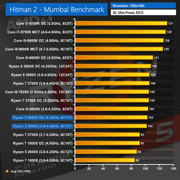 The speed bump brought about by overclocking the Coffee Lake i5 to 4.9GHz pays dividend in Hitman 2. The outcome from this clock speed adjustment is that the overclocked six-thread Intel chip outperforms the Ryzen 5 3600X by around 8%.