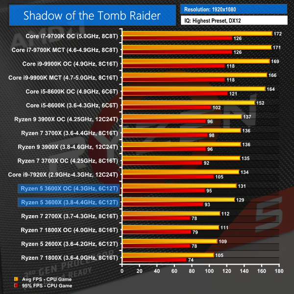 Shadow of the Tomb Raider shows more of the same, with the Coffee Lake Core i5 outpacing the Ryzen 5 3600X on average. Both CPUs show excellent performance in this title, but the Intel part is undeniably faster in terms of average FPS, provided you have a graphics card powerful enough to highlight the difference.