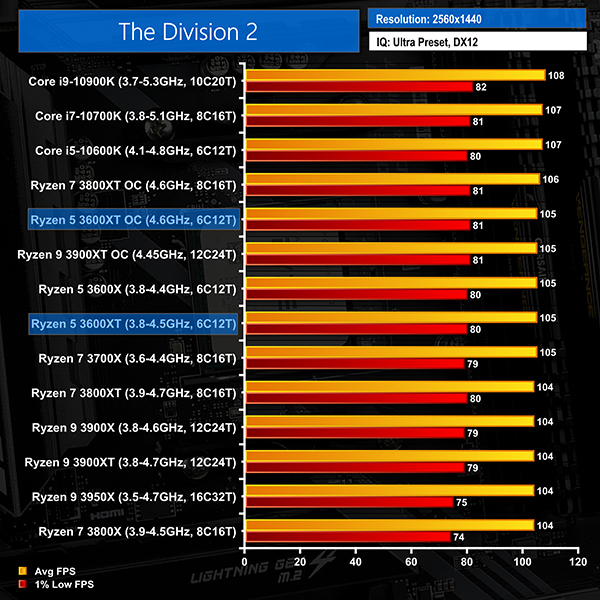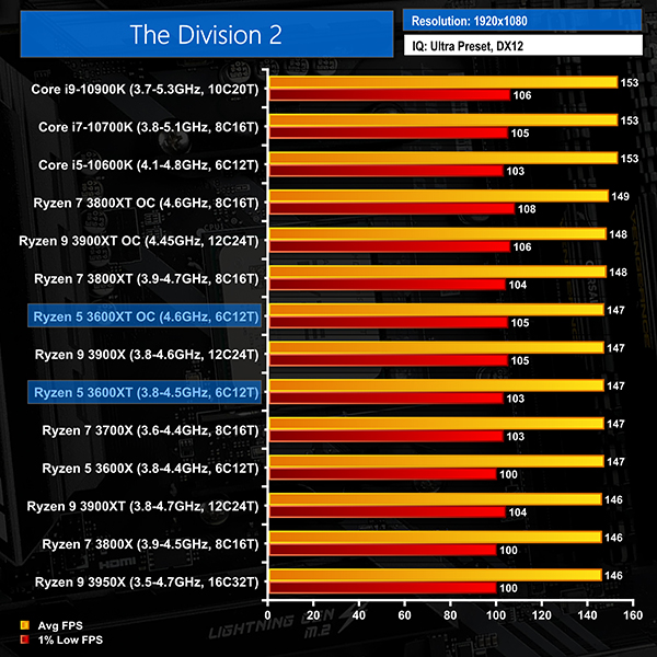 The Ryzen 5 3600XT performs well in the Division 2 at 1080P and realistically offers identical performance to the other Zen 2 chips. Intel’s Core i5-10600K is once again faster than the 3600XT, but 153 FPS versus 147 FPS is not that important of a frame rate differential; high refresh rate gamers will be very happy either way.