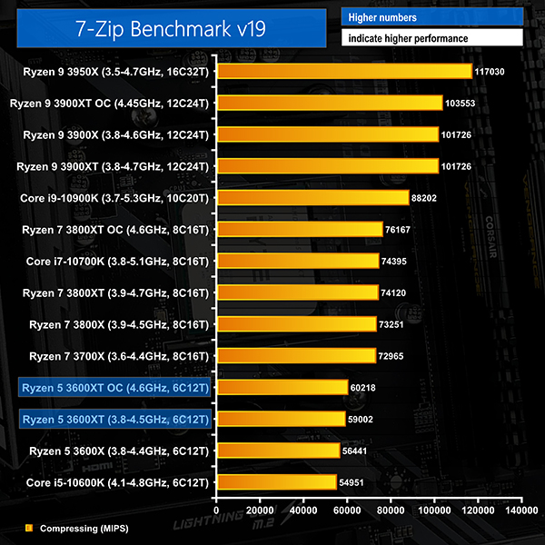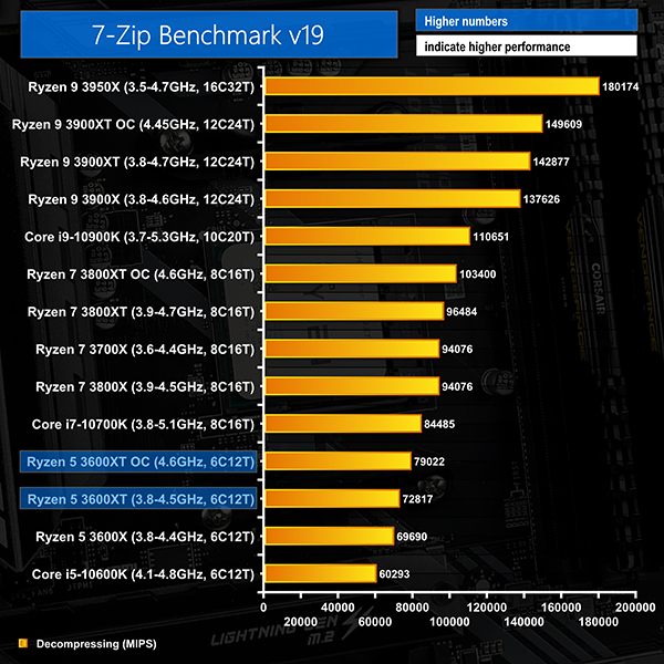 The same 4.5% performance gain for the 3600XT over the 3600X is observed in 7-Zip’s compressing test. Intel’s competing Core i5-10600K fairs a little better in this compressing test but the Ryzen 5 3600XT is still 7% higher performance.