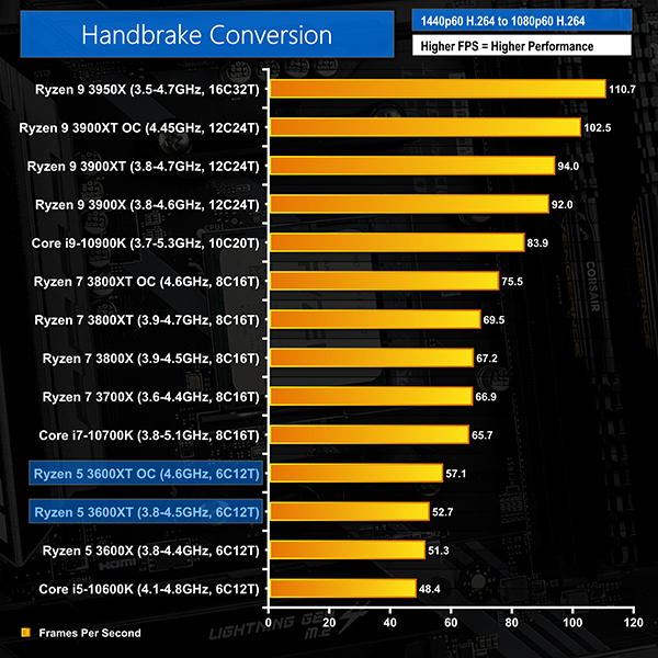 Overclocking the 3600XT to 4.6GHz allows it to leapfrog the stock clocked 10600K and significantly close the gap to the Ryzen 7 3700X. Frequency, balanced somewhat with core count, is clearly highly influential in this workload and perhaps makes the superb overclocking capability of the 3600XT of notable value versus the cheaper Zen 2 six-cores.