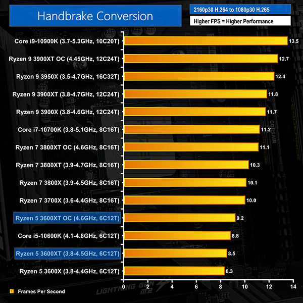 The new 3600XT delivers a performance increase of 1.4 FPS or just under 3% versus the 3600X in our Handbrake H264 test. Versus the Core i5-10600K, AMD’s Ryzen 5 3600XT is 4.3 FPS or 9% faster.