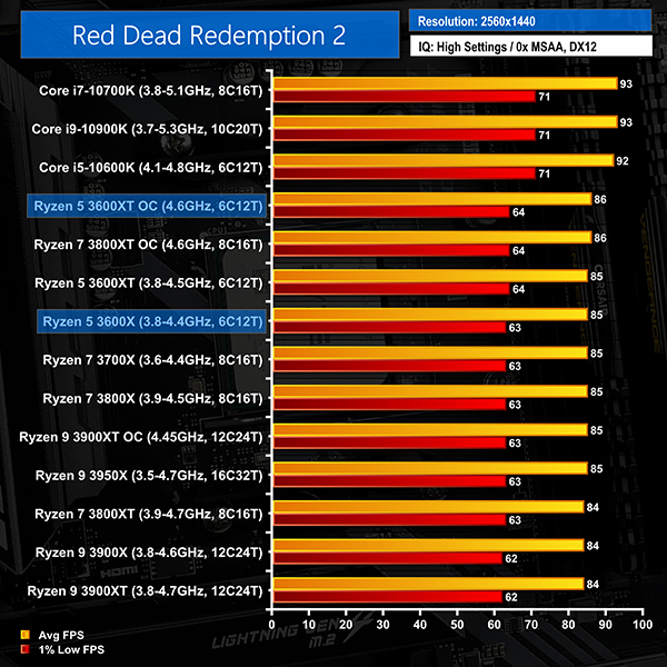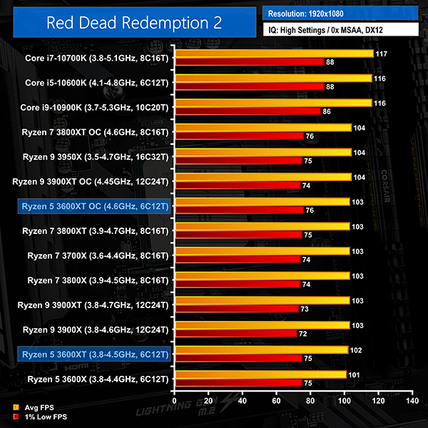 Red Dead Redemption 2 at 1080P shows the stock clocked Ryzen 5 3600XT to be just as fast as other Zen 2 chips when accounting for margins of error. Overclocking technically delivers a gain in average and 1% low FPS numbers, but the difference is realistically minimal.
