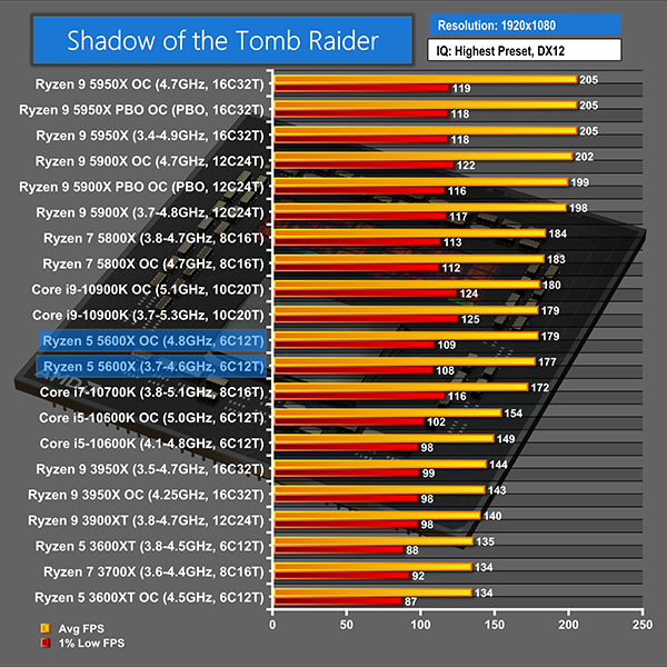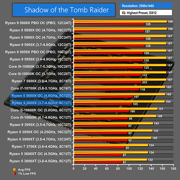 Shadow of the Tomb Raider performs well on Zen 3 and has the six-core 5600X smashing the performance numbers of its Zen 2 and 10600K competitors. AMD’s cheapest Zen 3 offering is actually competitive versus the 10700K here.
