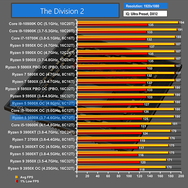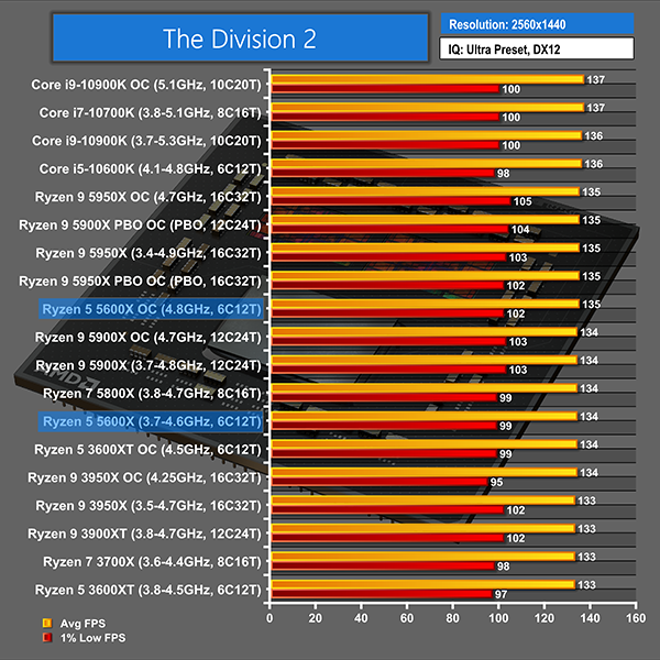 The Division 2 sees Ryzen 5 5600X once again outperforming the 10600K, 3700X, and 3600XT. Intel’s Core i5 provides the toughest fight, but the Zen 3 six-core is simply faster outside of a 5GHz Intel overclock.
