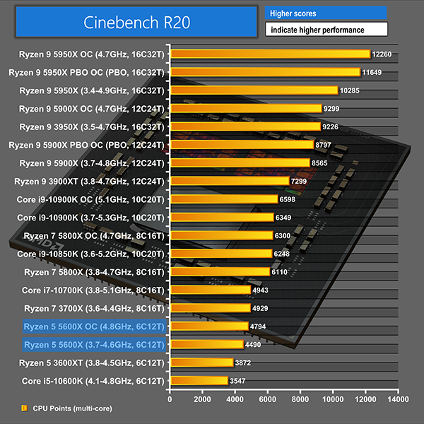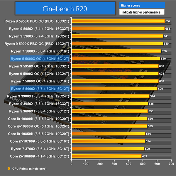 Cinebench nT sees the 5600X making a positive start. Performance is 27% quicker than the 10600K and 16% better than the considerably cheaper Ryzen 5 3600XT. The 8-core 3700X does score higher though, with a 10% lead over the 5600X but that gap narrows significantly with the Zen 3 part’s 4.8GHz overclock.