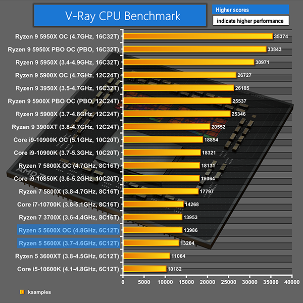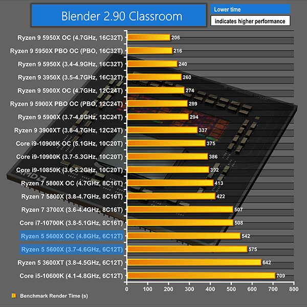 V-Ray sees the 5600X continuing to deliver strong performance leads over the cheaper Core i5 and Ryzen 5 chips. This time, the overclocked 5600X matches the stock clocked 3700X performance and is within touching distance of the 4.7GHz 10700K.