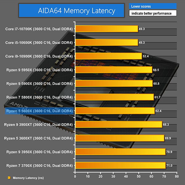 Memory latency versus Zen 2 continues to show improvement, even with this single-CCD Zen 3 part.