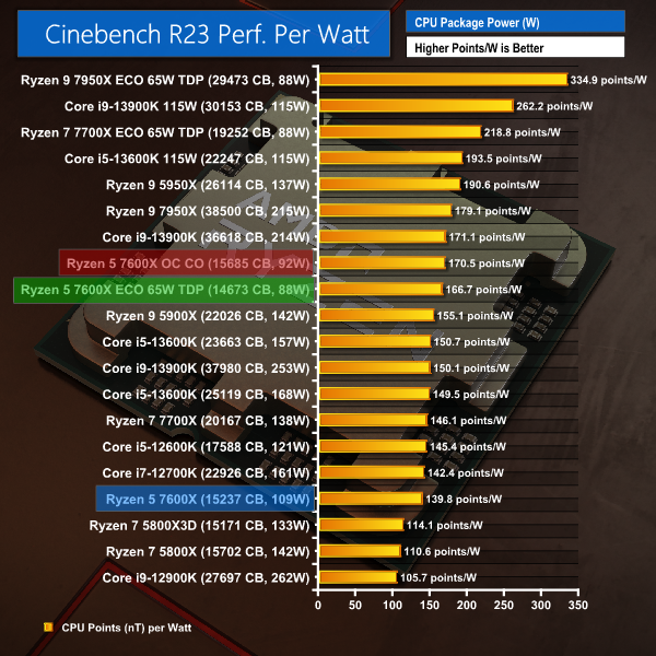 Looking at the Cinebench performance per Watt numbers, as a guide for the operating and productivity performance efficiency of each processor, Ryzen 5 7600X is pretty poor out of the box. This is by virtue of the default voltage that results in relatively high power draw for its performance level.