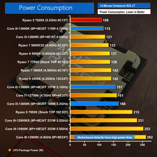 Looking at power consumption, the 142W PPT-rated Ryzen 5 7600X actually does very well in the current world of energy-sucking PC hardware.