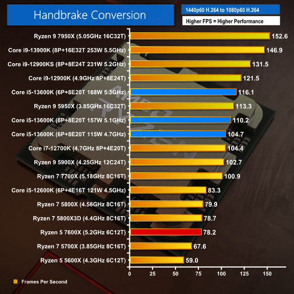 H265 video conversion sees the Ryzen 5 7600X put in competitive performance versus the 12600K and Ryzen 7 5800X. But, yet again, even the power-restricted Core i5-13600K is considerably faster than AMD’s newest Ryzen 5.