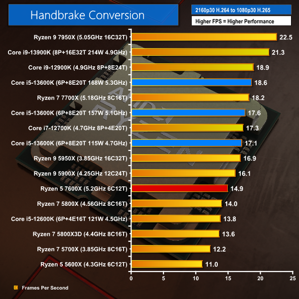 The Ryzen 5 7600X is very slightly behind its previous-gen Intel and AMD price competitors for Handbrake H264. Intel’s £50-60 more expensive Core i5-13600K is considerably quicker, even in its reduced power mode.