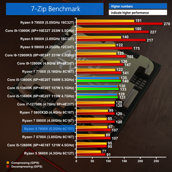 7-Zip is typically a strength for AMD, but there is only so much performance that 12 threads can provide. Here, the new Zen 4 chip’s performance sits above the 12600K and below the 5800X. But the £380 Core i5-13600K offers significantly higher performance in the three power modes that Leo tested.