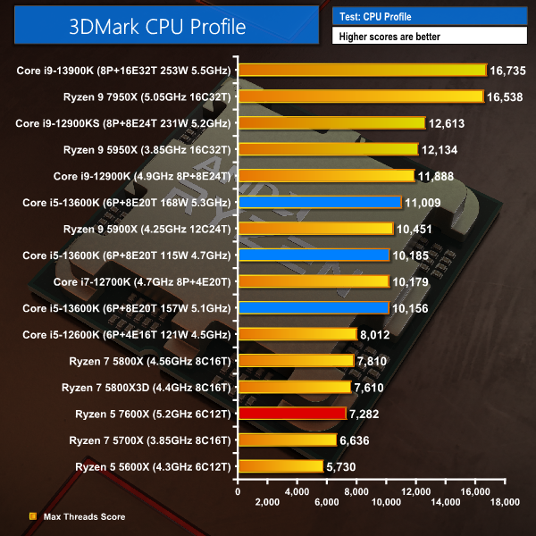 If you’re interested in 3DMark numbers, the Ryzen 5 7600X is pretty low on this chart. But I would not attach much importance whatsoever to this data unless you’re pushing for 3DMark records.