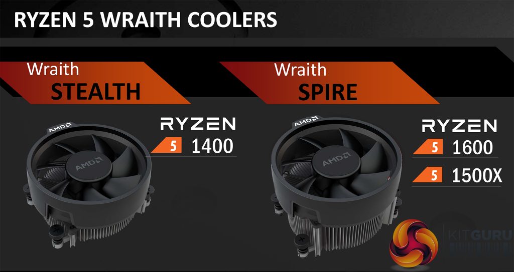 AMD will be bundling Wraith CPU coolers with the three 65W TDP Ryzen 5 parts. Ryzen 5 1600 and 1500X get the same Wraith Spire that is bundled with the Ryzen 7 1700, though it does not feature the LED lighting of the Ryzen 7 version. We tested Wraith Spire with the Ryzen 7 1700 and found it to offer solid performance with capability for a moderate overclock. Wraith Stealth will be bundled with the Ryzen 5 1400 CPU.
