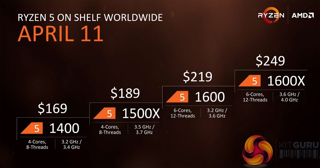 AMD has announced its Ryzen 5 processors which will be launched and on shelves from April 11th 2017 in the form of two 4C8T parts and two 6C12T SKUs. Pricing will range from $169 to $249 USD, with the Ryzen 5 flagship 6C12T 1600X featuring a Precision Boost clock frequency up to 4.0GHz.