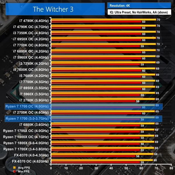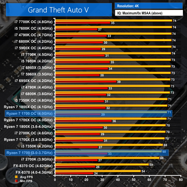 At 4K, where graphics horsepower is taxed and pushed to the forefront, Ryzen 7 1700 offers effectively the same performance as other modern Intel CPUs, including the i7-7700K. Grand Theft Auto V and its preference for Intel processors shows a slight performance deficit for Ryzen 7 at 4K but the around 2 FPS drop in average frame rates is minor.