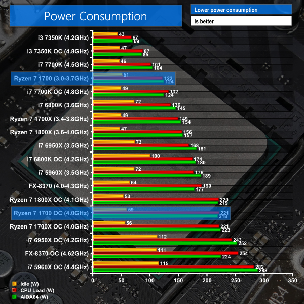 Overclocked using the same voltage as the Ryzen 7 1700X, Ryzen 7 1700 draws practically the same power.