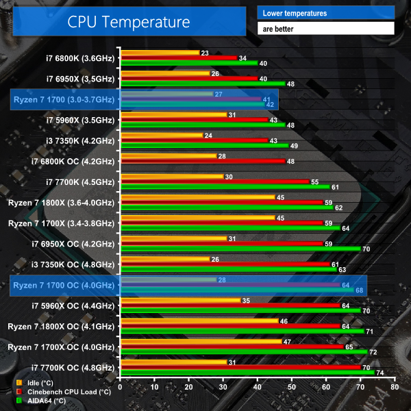 Thanks to its low power draw and superb heatspreader design, which uses solder and a liquid-metal TIM, Ryzen 7 1700 shows excellent temperature performance at stock. There have been suggestions that AMD's temperature-reading sensor is inaccurate, which has an influence on our analysis. However, limiting the comparison to other Ryzen 7 chips, the 1700 still shows excellent thermal performance.